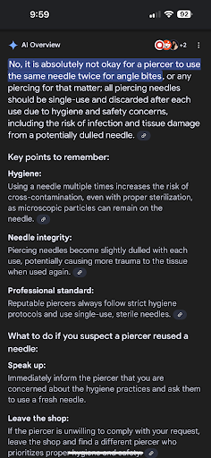 Read moreWell I was going to give it a 5 star until I found out that I was in fact right and the female piercer was wrong. I went in with my daughters and spent over $300. Which the review had nothing to do with the money. I wouldn’t take a refund even if they offered it because that’s not my point!! My daughter and myself got angel bite piercings and my other daughter got a surface piercing. When I was sitting in the chair, I noticed that she was going to use the same needle for both piercings. I thought if I remember correctly that’s not how you do it. Two separate piercings done on the same person get two separate needles. So I addressed her on this matter and she reassured me that yeah I’m going to use the same needle again to pierce the other side and it’s OK. Well, I posted it down below in a picture that it is not OK to use the same needle on more than one piercing because the needle could become dull or infection becomes a higher risk factor. This is unprofessional and it’s unethical!! The fact that she lied to my face is absolutely disgusting! I’m horrified. What bothers me more is the fact that how many other people has she done this to?
