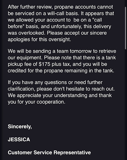 They promised me the last time this happened that no more automatic deliveries of propane would happen and it has happened yet again. So I was lied to and this is essentially stealing from me when you send deliveries that weren’t asked for or approved and then are all: “You have a past due bill of __!” and hang up on me without being able to have a conversation as to what is going on. I can’t have surprise bills because I can’t afford it.