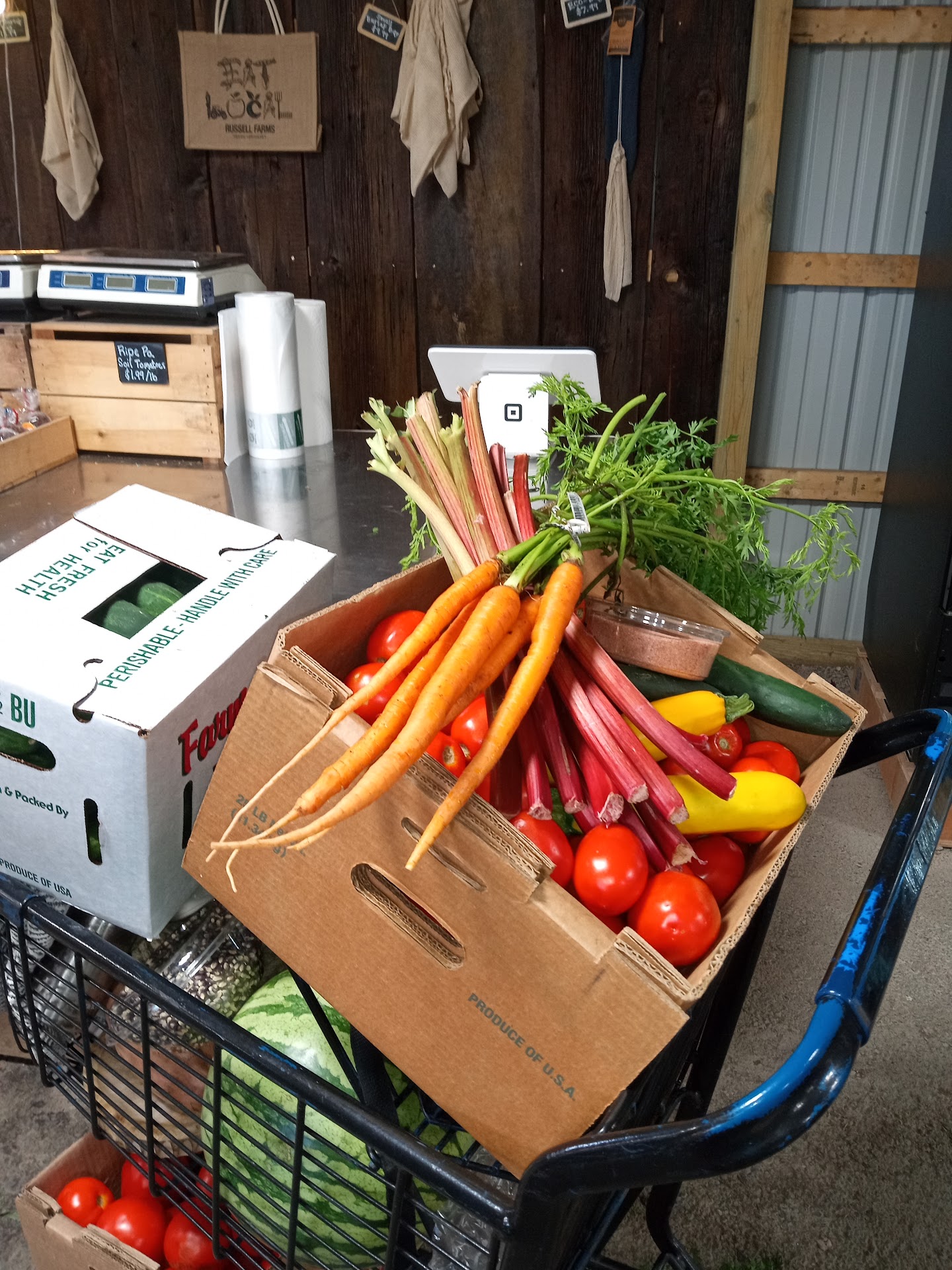 Love having a trusted, affordable source for fresh, local produce and pantry goods. We went today specifically for the "butter & sugar" corn, but were drawn in by brightly colored tomatoes, fresh peaches, and cucumbers too. Along the way we discovered some set-aside boxes of "tired" produce for just $6- an ASTOUNDING price for a few pounds of food! The contents vary from one box to another but the one I picked had an awesome variety that will make great, healthy, veggie-filled soups and stews.