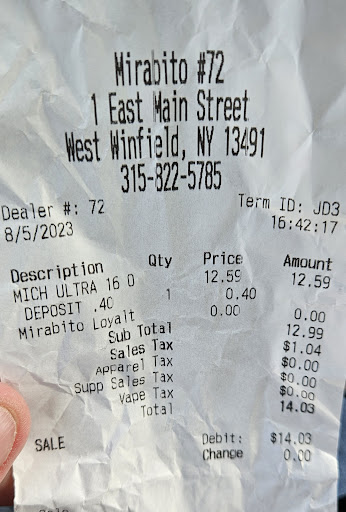 Read moreThey'll price things one way and charge another. $10.99 for a 8pk 16oz mich ultra is what the shelving unit says. rings up as $12.59+tx and bottle on the receipt.