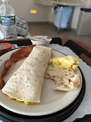 For BREAKFAST: Breakfast burrito,w/side of bacon, sausage and potatoes and more scrambled eggs, some salsa on the side. I dump all the above extra eggs, meats, and potatoes in the egg tortilla, add salsa, salt and pepper and roll up. I also get a Greek yogurt, fruit cup, bagel and cream cheese along with a hot tea and honey. Also good are the baked carrots mashed âpotato with gravy (with garlic powder)âchicken quesadilla, black beans, rice however, I ordered hot sauce for the beans & rice and the salsa I had left from quesadillas went into the chili. đ¶ïž