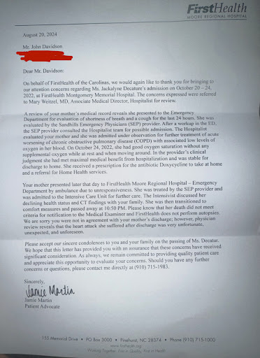 We had to inquire for two years to try and find out what caused her death. Two years! After years of going through hoops and trying to get answers, FirstHealth Moore Regional finally wrote me an OFFICIAL letter and let me know that the Associate Medical Director, Hospitalist did a review. They said that my mothers' death "did not meet criteria for notification to the Medical Examiner and FirstHealth does not perform autopsies". They also wrote that "the heart attack she [my mother] suffered after discharge was unfortunate, unexpected, and unforeseen".