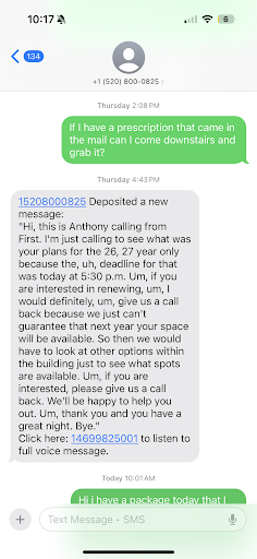 When I go downstairs to ask about my deliveries, the staff roll their eyes or act like I’m bothering them, instead of providing any real help. Today, no one was even there, and my packages are just sitting locked in the office. Even after communicating that I had a medication sitting in the mail room, I received no text back, and they even felt it was the right time to call me about renewing while ignoring my initial message.