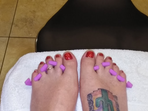 Read moreI was pleasantly surprised when I called and they said they could get me in with Kim (who I'd been referred to) right now! It was the lunch hour. When I walked in I was quickly greeted by several employees- all friendly, pleasant with smiles! I have a Service Dog that accompanies me - despite the fact the he is hypo-allergenic, well behaved and Federal ADA Law allows me to bring him into almost any establishment - other nail places have frowned upon him, or had an obvious disapproving look when they see him. They welcomed him with open arms. The atmosphere was nice - no blaring TVs - some relaxing background music. The decor was nice and very clean. Kim did a wonderful job on my feet! They were in an unusually bad condition; neglected because I've been moving. She took her time and got them totally smooth. She focused all her attention on me, and was nice to visit with. I was a bit indicisive on which shade of red. She tried each shade on my toes and even suggested 2 more! Glad she did, I picked one of those. My toes look beautiful! And I'm SUPER PICKY...I have OCD. All the clients in there were happy, friendly - and seemed to be very happy with their nail tech and the service they were receiving. I'm definitely looking forward to my next...