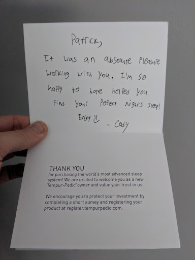 Read moreMy partner and I stopped in to test a Tempur-Pedic mattress over the weekend. I have significant disc issues in my back and we needed a bed with greater support.