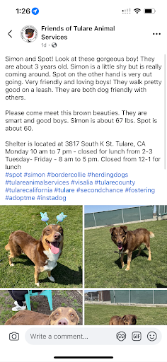 Ā Ā Ā Read moreMy husband and I drove through Tulare on our way home from visiting my in-laws for the holidays and when we stopped at a gas station we noticed a stray German Shepherd wandering around. I tried to call and report a stray dog at a very busy intersection who needed to be picked up and taken to a shelter, and the woman on the other end of the phone cut me off mid-sentence, saying that if the animal wasnāt injured or violent then theyāre not doing pickups because the shelters in all of Tulare and Fresno county are at capacity. She could have stopped there but she went on to say that she already posted this on social media and put the word out, making me seem like I should have known better than to call them. Hence the one star rating.