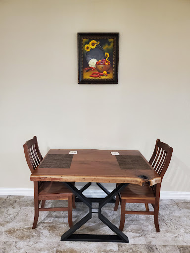 We have been able to select our own wood, which way doors would swing, whether there would be a door or drawers, stain, everything! We selected a dining room chair style from the floor and they allowed us to take it home to see how it looked in our home. Well, it ended up being too tall for the area, so we redesigned the top and my six chairs are perfect.