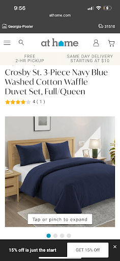 Read moreI’m extremely disappointed with the way my recent issue was handled. I visited this store for the first time the other day—it looked great and had a nice variety of items. I purchased the Crosby St. Navy Waffle Duvet Cover and was shocked to find it incredibly itchy and uncomfortable, even after one gentle wash. When I reached out to customer service about a return, I was told the store wouldn’t accept it simply because it had been washed.