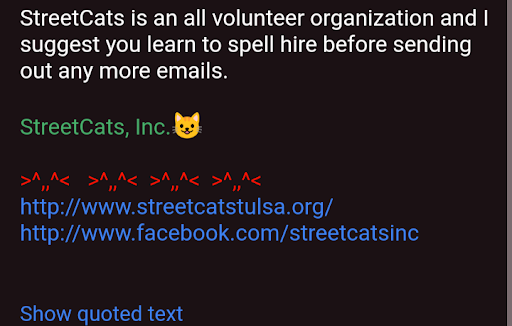 About 2 months ago, I had to put him to sleep, because he had gotten sick over night, and no matter what medicines I got for him, he was only getting worse, so I made the hardest decision I could to let him go peacefully in my arms. 2 months ago, I lost everything I cared about. So, remembering this rescue, I came back, looking for a new companion. Someone new to give love to. The volunteers were wonderful. They told me all about Charlie, and Zoey, and Max. They were friendly and warm to me..... So tell me why, after I put my application and got my call back was I told that I was banned from adopting from them? Oh, because I should have given Smokey back after 5yrs. I should have given him up after throwing myself into debt TRYING to save him, and cause a sick and dying cat even more distress by abandoning him. And instead of letting me explain what happened, I was told in the most condescending tone that I made the wrong and worst decision, claiming it was "medical negligence". I did everything I could. But you wouldn't listen. Linda. I hope you read this. Because I spent the entire day, reliving every moment I had with Smokey, INCLUDING his final week where I cried relentlessly. The final hour where he looked so peaceful to be curled up in my arms. Thank you for invalidating all the love and patience and care I gave Smokey for 5 years. Clearly, your stance on letting him die in the presence of strangers who don't care about him like I did was the correct one.