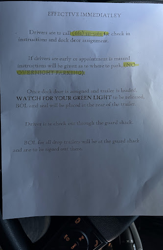 Once you waste 5 mins checking in with security, they direct you to a spot to park and wait and give you a sheet with a phone number to call and check in a 2nd time. This person assigns you a dock, back up, they load (been here 40mins yet, backed up but not being loadedā¦ā¦) and then they leave BOL and seal in the back.