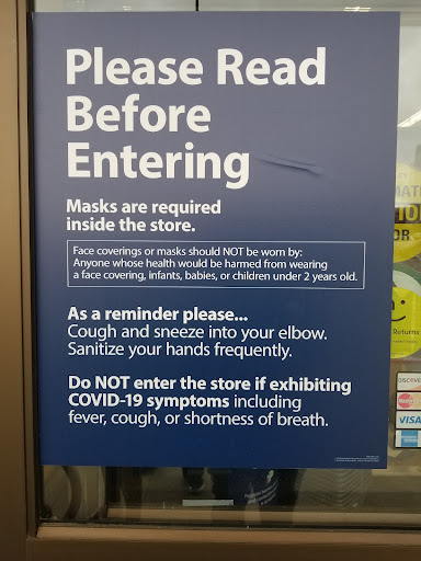 Here is a sign that the store management seems not to care about or acknowledge. They would rather harass an elderly woman and family who cannot wear face coverings for medical reasons than abide by their own publicly posted policy.