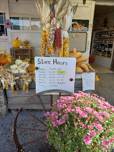 Pull in driveway and alongside the big red barm is the little white store. Open until 8 pm most nights. Closed on Sundays.