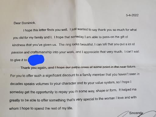 Read moreDominick is absolutely amazing and his craftsmanship is a work of art with reasonable pricing! He left my jewelry looking better than when I first bought it brand new!! He holds his business in his home so it truly feels like a Mom and Pops place! Him and his family are so kind and professional, it feels like a warm hug when I’m there and brings a sense of community into the air. 1000% to infinity I recommend taking your jewelry to him!! This place truly...