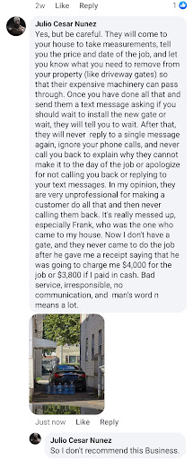 Yes, but be careful. They will come to your house to take measurements, tell you the price and date of the job, and let you know what you need to remove from your property (like driveway gates) so that their expensive machinery can pass through. Once you have done all that and send them a text message asking if you should wait to install the new gate or wait, they will tell you to wait. After that, they will neverĀ reply to a single message again, ignore your phone calls, and never call you back to explain why they cannot make it to the day of the job or apologize for not calling you back or replying to your text messages. In my opinion, they are very unprofessional for making a customer do all that and then never calling them back. It's really messed up, especially Frank, who was the one who came to my house. Now I don't have a gate, and they never came to do the job after he gave me a receipt saying that he was going to charge me $4,000 for the job or $3,800 if I paid in cash. Bad service, irresponsible, no communication, andĀ man's word n...