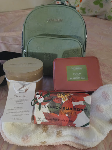 Read moreStopped at HomeGoods and Marshall's for this gift for these two stores are right next to each other...The other day I was Listening to the news and reporter stated start your Christmas shopping now there is a going to be a very limited amount of goods available this year So I stopped here at this mall to purchase my first gift of the Christmas season. A Steve Madden leather light green knapsack, simple but elegance. A Wendy Bellissimo Pecan pie candle. Smells fantastic. A tin of Tea Garden peach & mango tea 50 bags, a Cinnamon Blueberry Bar of Cannella Mirtillo Soap smells great and 3 pairs set of soft socks. Everything fits inside the green knapsack. A perfect gift for one person. Total spent on this gift $50.00 A+...