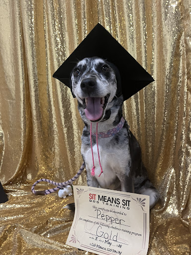 Arlo went from pulling our backs out and having full melt downs around other dogs.. to sitting with a graduation cap on for a picture while another dog was in the room staring at him. Arlo showed very quick improvement and we are looking forward to working towards more skills utilizing their...
