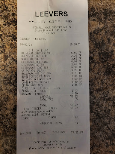 Read moreThis location is locally known as "the good Leevers" as opposed the the other location in town. Leevers had a monopoly on groceries in Valley City and the prices reflect that. I stopped in to grab a couple of items and during check out I noticed the checker in the next aisle over (Dempsey) was very friendly and chatty with the customers as he checked them. This is what you would expect from a local small town store. The checker I had never welcomed me or asked if I found everything. Didn't say thank you or even if I wanted my receipt. No smoke, no interaction at all. Leevers lacks in training as this is typical of my experience there. They should put Dempsey in charge of training for customer service. Next time I will wait in a longer line if I have to to check out with a checker like him that makes you feel like you are an...