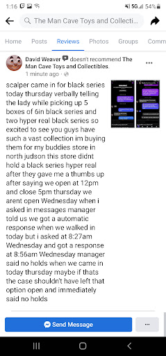 Read morescalper came in for black series today thursday verbally telling the lady while picking up 5 boxes of 6in black series and two hyper real black series so excited to see you guys have such a vast collection im buying them for my buddies store in north judson this store didnt hold a black series hyper real after they gave me a thumbs up after saying we open at 12pm and close 5pm thursday we arent open Wednesday when i asked in messages manager told us we got a automatic response when we walked in today but i asked at 8:27am Wednesday and got a response at 8:56am Wednesday manager said no holds when we came in today thursday maybe if thats the case shouldn't have left that option open and immediately said no holds