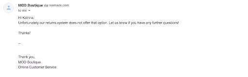 Read moreWish I would’ve read the reviews before I purchased. This company has horrible customer service. I purchased a size small sweater. It was way too big on me so I went to exchange it. Since it was the smallest size I looked for something else to exchange it with. Every single thing I was even remotely interested in was out of stock or I couldn’t exchange it because there was such a limited quantity(they don’t hold items for exchange so if there is only a couple left in stock it doesn’t let you choose the item to exchange.) also, when you go to exchange it gives you items you can exchange for but doesn’t show price point of what the exchange amount is so you have no idea if you’re exchanging for the same value item. I emailed asking what to do since I wasn’t able to exchange for something else that i wanted and I was told to put the product I wanted in a note in the bag with the item I was returning but no guarantees. I instead ordered the items I wanted(my mistake I guess) and asked them to refund to my card. I was told no. First excuse was because I didn’t exchange for exact price(I spent MORE money on my second purchase). Second excuse was it was easier to refund to store credit than my card. Easier??!? I went back and forth and eventually was told that my request would be sent to management and management never reached out to me. They issued store credit instead with no further contact. Save yourself and don’t buy from...