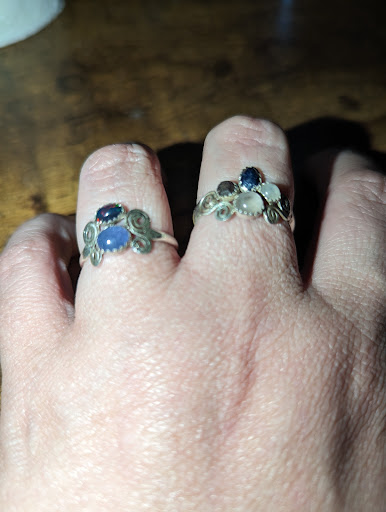 Sarah, the owner and designer, made a very specially commissioned piece for me for mother's Day, a beautiful ring with all of my kids stones. I absolutely love it and the beautiful extra she sent with it. A perfect set. I never took them off as soon as I got them. I got so many lovely compliments on them everywhere I went. I'm pretty rough on my jewelry though since I never took them off and all through chores and such, I ended up losing a stone. I contacted her and asked if she could fix it. Not only did she offer to fix it but she took time out of her vacation to come grab it from me at my home to take it with her to fix. Saving me postage on top of everything. She really goes...