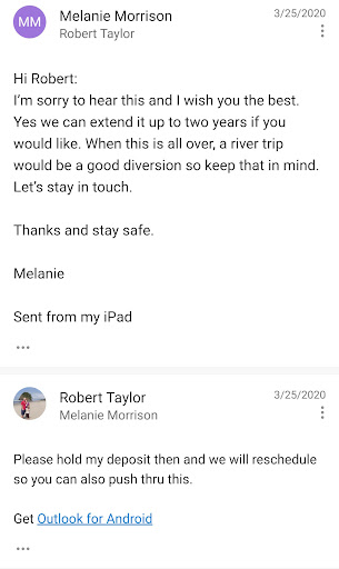 I put down a deposit of $525 just prior to Covid stay home orders March 14th 2020. I emailed 11 days later to get a refund. Melanie said they could hold the deposit 2 years until after Covid. I agreed to help them. When we decided to not do the trip I reached out again to get my refund once again. Melanie emailed back saying the credit card was expired. (I had already gave her the current number again.) I called again from a WORK phone so she would take my call and gave her the credit card 💳 number again. STILL NO REFUND. I have now emailed Melanie several times (3) without a response. She has also 🚫 BLOCKED my phone number also I have left several messages without any...