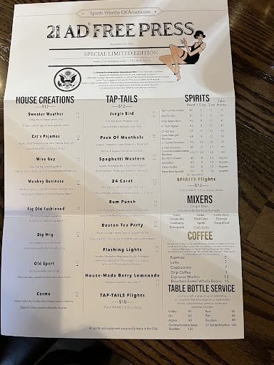 The spirits at 21 AD were developed with care and take center stage. I am particularly fond of their house bourbon. My wife and I lived in New Orleans and she has an affinity for a good cocktailâŠ.the old fashioned does not disappoint. I found the Boston Tea Party to be refreshing and not too boozy. They have a great selection of gin, vodka and tequila cocktails on the menu as well (all using their own spirits!), so you should be able to find something to you liking, including non-alcohol options.