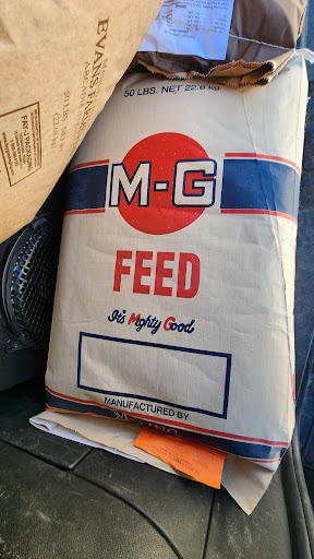 We've been here a couple times but never for chicken feed. I purchased these four bags of chicken feed which are 50 lb bags for a total of $68.50. It's $17 ea. for the pellets and $17.25 ea. for the crumbles they have all kinds of different feed and buckets and all sorts of accessories for your animals of all types and they load the food for you if you want. I appreciate Wayne loading up our feed...