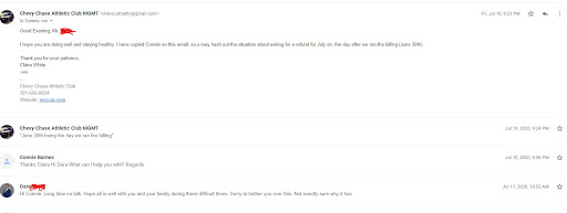 I rarely every provide reviews, but this review is in response to the utterly unprofessional and unethical behavior by Chevy Chase Athletic Club. Once the pandemic had begun all memberships were put on hold. One June to my surprise I saw my card automatically charged without deciding to resume services. On July 1st I call the club stating I would like to cancel my membership as we are in a pandemic and would like a refund for June. The club refused to refund my June membership due to claiming financial hardship. With that said, I said okay, but please cancel my membership from July onward. Today is 10/2 and I am still being charged when I sent numerous emails asking for my membership to be canceled. This is outright stealing and I will be submitting something to BBB.
