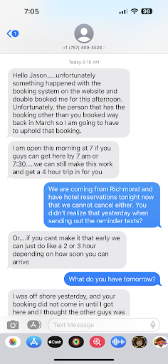 Read moreBuyer beware. Booked on 8-13 through the companies site got multiple text messages starting at 6:17 PM with what to bring where to go and what not. Then at 6:18 this morning he realizes that he has been double booked and blames it on his booking system which I would have expected him to realize last night when sending all of his booking/reminder emails. He then says he is going to refund the money which he sent and i was charged a fee for it taking $20.00 off of the amount I originally pay. When asked you can see his response of it was my faulty and good luck finding another boat. I hope this saves someone else the headache of dealing with...