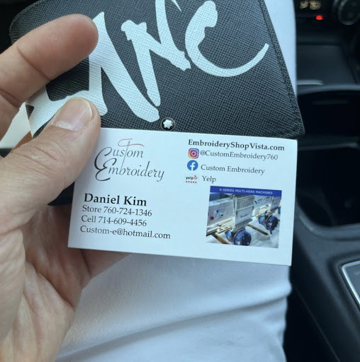 Daniel welcomed my “small” order with the same level of service and quality that he gives to much larger orders from businesses! So happy I found a shop that’s willing and happy to help individuals. His shop has the latest tech to produce high quality stuff! He even worked with me to help me get my logo just right even though I didn’t have a high quality original image file of what I wanted embroidered! I was referred here by another “small business” embroidery shop from Oceanside bc the other shop didn’t want to help me because they only cater to businesses. Daniel and the team at Custom Embroidery obviously welcomes orders small and large and treats them all with the same level of quality and service. Happy to support small family businesses like this one. Looks like he has all the latest machines and technology. Great showroom with...