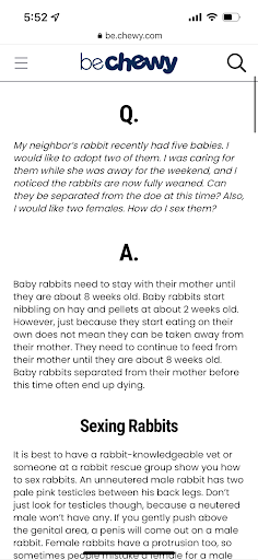 The women who sold us the bunnies were very sweet, however, two weeks after purchasing our bunnies, they died. They sold us them at 5-weeks old, which is too early to ween off their mothers, causing digestive and immune issues- which we did not know until the first bunny died. They should not be weened off their mothers until after 8 weeks (a simple google search I completed). I ask that they do their research before selling animals to families, PLEASE save the heartache AND DO YOUR RESEARCH. This is malpractice and don’t believe you should sell animals you do not have expertise on. Please consider this before...