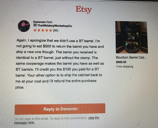 Buyer Beware My experience with The Whiskey Workshop and owner Donovan Lee was a nightmare. After reading reviews and messaging Mr. Lee on Etsy, I ordered a liquor cabinet made from an authentic Buffalo Trace whiskey barrel with original distiller stamp on the bottom head, and custom engraved on the top head with Buffalo Trace logos and brands of whiskey. The nightmare began when I received the liquor cabinet and it wasn’t what I ordered. The cabinet I was sent had not been made from one of the three authentic Buffalo Trace whiskey barrels that Mr. Lee said he had when I ordered and did not have the original distiller’s stamp on the bottom head. I immediately contacted him and he replied, “You are correct. It appears we picked the wrong barrel from the stack. I will credit you back the $100 you were charged for the BT upgrade. Sorry for the mix up.” When I told Mr. Lee this was not an acceptable resolution, and I wanted the cabinet made from the authentic Buffalo Trace whiskey barrel. He told me that, “I apologize that we didn’t use a BT barrel. I’m not going to eat $500 to return the one you have and ship a new though.” He also said my other option was to send the cabinet back to him at my cost, $614 quoted from FedEx, for full refund. Neither of these options were agreeable to me since I paid $1,098 for a cabinet made from an authentic Buffalo Trace whiskey barrel, and Mr. Lee was unwilling to resolve the matter in other way, so I was forced to call my credit card company and dispute the charge and stop payment. Only after stopping payment and telling him I would sue in small claims for breach of contract and fraud was Mr. Lee willing to pay return shipping, his cost of $148 which he stated later, and refund me 100% of my purchase price if it was returned in the same condition as he sent it. So this review isn’t exhaustingly lengthy, I will just highlight other messages from Donovan Lee that I received during our correspondence. He said, that I was being petty because the distiller stamp was on the bottom and couldn’t be seen. Not to preach to him about customer service, he’s flown across the country to fix customers’ cabinets, and he didn’t want my business. He stated, that we were under no contract when the item purchase was made and paid for with no expressed guarantee or warranty and in as-is condition and he had no obligation to refund me any money, that as an accommodation he approved my return of the item for 100% refund. When I offered to pay $500 for the cabinet that I was sent in error, I was told I was trying to extort him. I was also told that, “if you refuse payment (proceeded with the dispute with my credit card company) without returning the cabinet in the condition it left my shop in, my attorney will file a complaint with the FBI for interstate wire fraud, larceny, and extortion. I have made every reasonable effort to allow you to return the item at my expense for 100% refund. I fail to understand your reluctance to accept this offer.” I returned the cabinet I was sent, in the same condition I received it. There are multiple reasons I didn’t want to accept Mr. Lee’s offer. First, I wanted the cabinet that I had ordered made from the authentic Buffalo Trace whiskey barrel with an original distiller stamp and wouldn’t have ordered the cabinet otherwise. Second, I didn’t understand why Donovan Lee wouldn’t send me the cabinet I ordered, until he finally stated that my cabinet was “accidentally” sent to another customer. Fourth, thewhiskeyworkshop.net says, “Our Promise to You: Premium woodwork -reliable and professional, Your satisfaction is guaranteed.” Obviously, my satisfaction was not guaranteed. Finally, Mr. Lee never offered me a satisfactory resolution, only offered to refund 100% of my money as a last resort, and the communication I had with Mr. Lee after I received the wrong cabinet was hostile and unpleasant. As of September 8, 2021 a full month after signing for the returned cabinet on August 5th Mr. Lee has still not fully...
