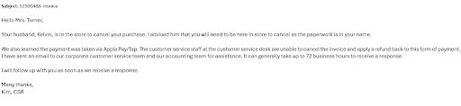 This is not just a simple miscommunication. This is a blatant display of poor business ethics, a lack of honesty, and an intentional effort to avoid fulfilling a basic customer obligation. If your team cannot process refunds for Apple Pay transactions at the store level, then they should have never instructed me to come in person in the first place. The fact that no one seems to know the correct refund process is deeply concerning and completely unacceptable.