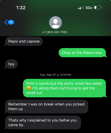 Although I overlooked these concerns initially due to a pressing need for quick turnaround, my patience was severely tested. During my first transaction, the shirts I received had a strong smell of marijuana, and I was asked to run errands to the store for unrelated items like a roll-up and a coke. Despite the inconvenience, I reluctantly agreed in hopes of receiving my order promptly. However, I spent hours steaming and airing out the shirts to remove the odor.