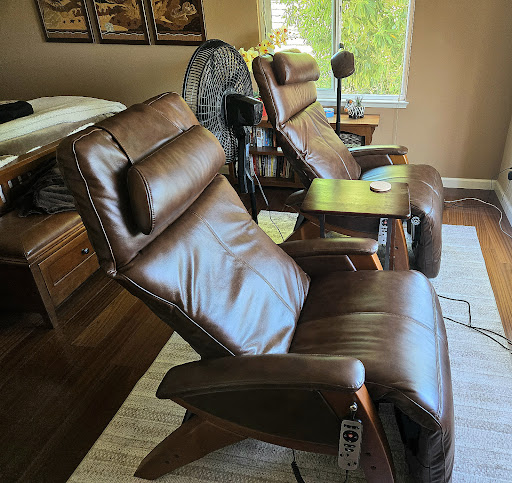 Read moreWe shopped and purchased our Hale Premiere Zero Gravity Recliners and an Ultimate Executive High Back office chair from James at Relax the Back in Walnut Creek. James' explanations and patience with us was very helpful in our decision. I am tall and large, it has been difficult to find a recliner that will hold up to my weight. After being disappointed in La-Z-Boy's quality for the last 4 chairs we had purchased we were looking for an alternative. (My mom left us with her zero gravity chair and after my back surgeries and broken arm, I realized the value of a Zero-G chair.) James helped us select the best match for the chairs we were looking for and I was also shopping for a very good office chair. The customer service from James and Relax the Back's delivery firm, Guizar Delivery's Juan and Chris, I would recommend Relax the Back. They got us our recliners in a lot less time than La-Z-Boy. I am still looking forward to receiving the...