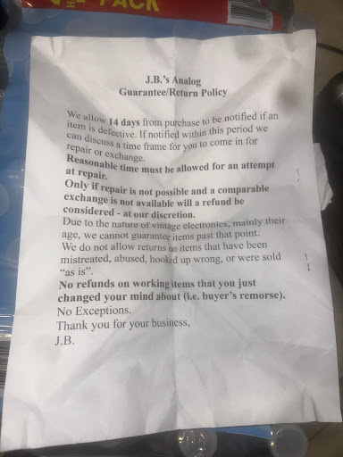 Read moreFive Star ⭐ for the very nice lady who has been there whenever I have visited. Very helpful and honest. One of the brags on their website, is that you can get more for your money than you can on the websites like ebay or Etsy, etc. Possibly this is true, however, the bottom line is this. Most of the items at JB's (And, I emphasize, MOST..., Not all.) Show signs of being previously used, while it SEEMS like more of the items on the websites LOOK nicer than some of the things at JB's, NEVERTHELESS, at JB's, you can test the items for function and performance, because they have such a great variety of things, you can get a better idea of how the items will perform once you get them home. My wife introduced me to JB's (!) And the last time I was there, looking for a turntable, there was a cheap SONY usb unit that looked like new, it basically was. The guy that tried to buy it before I did tried it out in the store, but couldn't figure out how to get the drive belt on, but I got it to work no prob, and got an essentialy new $200 turntable, for... A LOT less! Also picked up a used but very nice system cabinet to put all my stuff in for a very nice price. With the new turntable on top and my Amps, Disc players, and such in the cabinet rack, it makes my office, study, music room, Batcave look and function much better. If you are interested in putting together a home theater, stereo system, or yes, a BAND, and want more bang for your buck, then check ✔️ out JB's Analog. They have plenty of digital audio, and...