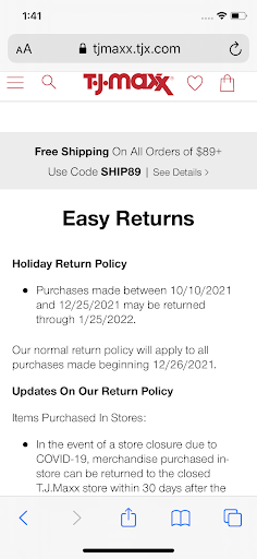 Read moreWARNING: They do not follow corporate website “holiday return policy”. Make purchases at your own risk, and do not expect any customer service. A barb wire fence is friendlier and more helpful than this small town joke of a store. Trust me, you’d be better off shopping at a different TJ Maxx. Worst customer service experience ever. Just another lazy good o’l boys club that doesn’t follow corporate standards or rules with zero accountability. Nothing easy about making a holiday return there that follows website guidelines! Unless they are discriminating by picking and choosing who they will allow to do holiday returns? I made my purchase within all of the following guidelines within the photo below, I had the receipt, and they refused my return. I’m seriously done...