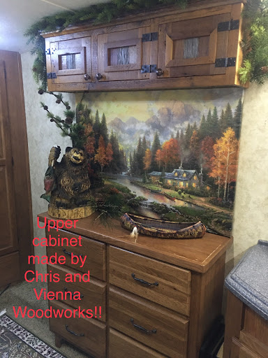 Read moreThank you entirely, Chris and Vienna Woodworks, for the perfect custom cabinet—wow! It’s a beautiful work of art! ❤️ We live in our fifth-wheel full time, and wanted to redecorate with cabin-theme decor. We needed to add more storage space in the bed/bath area. We removed the tv, small side shelves, and valance above the emergency exit window (still accessible behind the canvas print) and wanted to add an upper cabinet. We showed Chris what style of rustic cabinet we liked, and he created it! Reclaimed barn wood is not easy to work with. His layout was perfect, every single joint, both inside and out is precise, the door trim detail and crown are fantastic, the doors close perfectly and are not even slightly warped, the stain color, finish sealer, and hinge and knob placement are flawless. We couldn’t be happier with the finished piece! Thank you, thank you! We will highly recommend you...