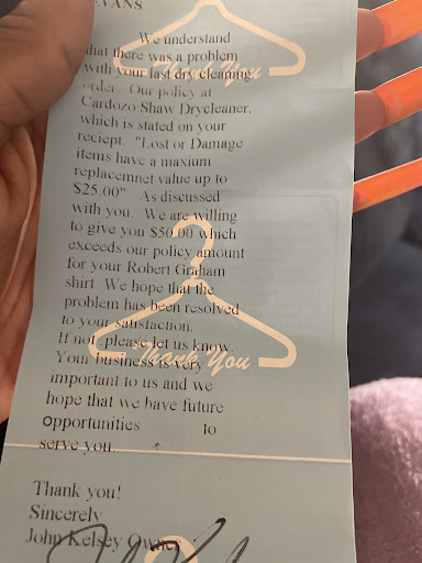 Read moreHorrible experience here. This place ruined my shirt by marking it for wash when it clearly stated DO NOT WASH. The owner admitted fault and I was told I would not be reimbursed fully for my $300.00 Robert Graham shirt. The owner low balled me a 50 lousy bucks, not even half the value (which I provided proof of).. He actually said their policy is to refund up to $25.00. Please don’t ever use this place if you value your clothes. I’m so upset because this was my first experience using the dry cleaners....