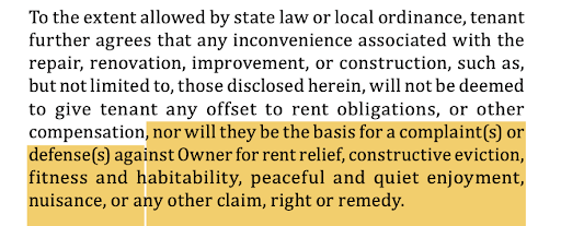 You actually sign away your right to "peaceful and quiet enjoyment" of your apartment here! See the attached photo for the specific language in the lease. I am shocked, and not entirely convinced, that this kind of language is legal or enforceable in a rental contract. For reference, construction-associated noise is extremely disruptive and begins at 7:00am ET weekday and Saturday mornings. I have even had to ask construction workers to stop construction at 8:00 and 9:00pm ET, which is the building's own policy. That is a solid 13-14 hours of extremely disruptive construction noise and disturbances.