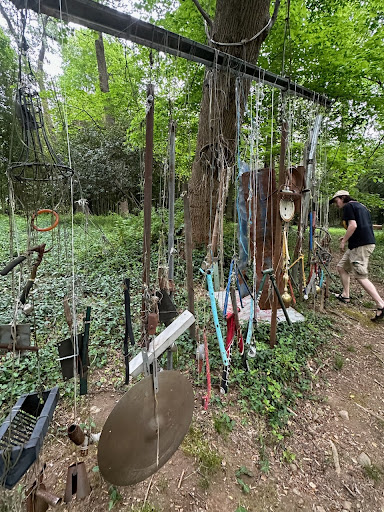The Glass Forest is one of the most obscure hidden spots in Washington, D.C. If you drive to the Palisades neighborhood in NW DC along the Potomac River, go to the Palisades Playground parking lot. Facing the playground, go left own a tiny faded path. You'll feel like you're walking in people's backyards, but you're not. After a few feet there will be a small path to your right. Go down that for a few seconds until you see things hanging from the trees- bits of glass, parts from bikes, bras, CDs, all the things. It's an outdoor art gallery with several exhibits hanging from trees. There's a small bench...