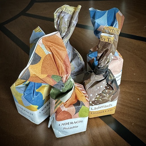 To say the least, the quality is absolutely amazing. Some standouts: Tartufi (any) and the dark chocolate bark with hazelnuts. LĂ€derach seems to be more of an innovator, rather than keeping with classical pralines etc. Those are all available but their unique barks and Tartufi are standouts. The Tartufi are a very unique texture that's indescribable - slightly crumbly but with a hint of marzipan density (not the flavour). The products are not cheap but as I texted my son while testing it was "almost a religious experience". Heh.