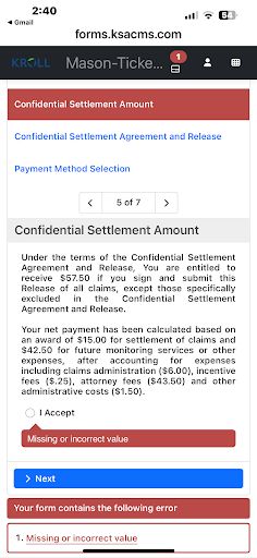 Read morewas told by Mason LLC that they were working on my individual settlement offer with AT&T, I then received a low offer from Kroll $12, when I know I was impacted by BOTH breaches.. I was compromised so many times due to the att data breach. Over $7000 was taken from my bank account & in my credit report it shows that my information was linked on the dark wed by at&t. I have attempted to contact Mason LLC numerous upon numerous times, I needed to speak to them to find out what in the world is going on because I refuse this lowball, but NO ONE is responding to my several emails or voicemails. Mason llc took my information, received a lawsuit, offered me $12 & stoped communication. Dealing with this is even worse than the initial lawsuit because I thought i could...