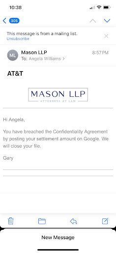 Read moreI have been reading the reviews & i find a lot of them to be very interesting. Some of them are similar to my experience. Mason LLP got in touch with me about an AT&T data breach early last year. Now i know law cases take a long time to process everything. Finally, they sent me a email stating that AT&T was ready to offer me a settlement. I was all happy because this situation will finally be behind me. When i tell you what they was offering me i nearly passed out. All this time they allegedly took to get to settle was a waste of time for me. The firm kept sending me emails to waste more of my time. they sent me a link to fill out all this paperwork for $12. this is what all of this comes down to $12. I'm not going to tell you HOW DISSAPPOINTED i am with this firm. I couldn't finish the paper work, because what they received from this so let it be. MASON LLP IS NOT A REPUTABLE COMPANY. I am not recommending anyone to them. Also, they can keep the $12 dollars. I am going to look for a way for this company to be accountable for what they're...