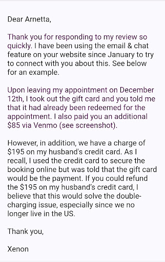 ORIGINAL REVIEW: I was gifted a $150 gift card for my birthday. After my massage, I was told that it had been deducted. I paid the remainder and tip via Venmo. After December, my credit card bill showed another $195 charge by the company. I have tried to reach out to Arnetta at least 3 times with no response. I have unintentionally paid over $400 for a massage. That said, the service was great. Just...