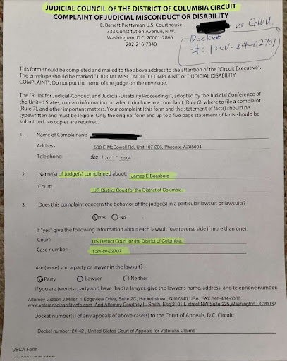 In response to these failures, we have assisted the veteran in filing a formal complaint with the Circuit Executive and the Judicial Misconduct Committee, which exercises oversight over this court. Additionally, a separate complaint has been filed with the DC Bar Association to address the legal and ethical implications of these delays. Exhibits documenting the court’s disregard for procedural fairness and violations of 28 U.S.C. § 1915 have been submitted to the appropriate authorities.