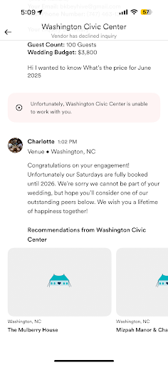 The venue has lots of amenities and offers packages that suit small and large weddings! We were able to add on items to the smaller package and also had our linens done through the venue. There is no preferred vendor list which is something I found to be a must when searching, they do have suggestions if needed.