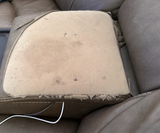 Literally, I wear high rise jeans, a T-shirt, and an oversized cardigan basically every single day during the months that the damage occurred. The damage is where I sit. I literally just sit there, on my phone, taking a break from life about one time a day maybe two, every day. My skin doesn’t touch the chair here, I am not sweaty or wet when sitting, I do not spill things, nothing. There is absolutely no excuse for this couch literally falling apart from regular, non-abusive use.