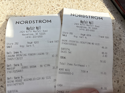 Read moreGreat selection of merchandise and well merchandised. Some of the staff leave a lot to be desired. We wanted to purchase a Kurt Geiger handbag and I didn't have my Nordstrom card so I gave the salesperson my driver's license. I looked to zip up my crossbody bag and the sales person was no where in sight. She returns and says she had to check on something. NOT WITH MY DRIVER'S LICENSE IN HAND. She knew better. She was unprofessional, disrespectful and inconsiderate. She broke rules walking away with a customers personal identification in her hand. There was no reason for her to do that. She could screenshot it and/or make a purchase. I had been waited on by her before and after checking out and being fitted for alterations I received 6 notifications that my alternation was ready for pickup for three weeks. I picked up the pants I had altered the next day. So I am done with the Nordstrom at Mayfair. I will be a new faithful client at Nordstrom on Michigan Ave. from now on. It's a shame. I found a manager but he didn't seem to be compassionate at all. I don't want to play the race card but myself and the salesperson and manager are all persons of color. It really burns me up when we treat our own people with lower quality than if we were servicing a person of majority. It happens because the retraining and corrections apparently are not in place. She really should be discharged for what she did. I actually locked my driver's license and discontinued my charge card. There are so many dishonest people that have no respect or regard for the people and the reason why they are...