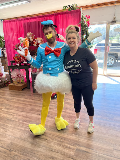I must share the quack-tastic experience we had at Remembrance Flower Shop in Weatherford. Our friend Mitch, having lost a bet, turned up in a costume that gave Donald Duck a new run for his money. Picture this: a grown man in fluffy white duck pants, with bright yellow leggings and webbed feet so big, they could've doubled as lily pads. But the pièce de rÊsistance? His dashing blue jacket, matching hat and oversized red bowtie that surely made the original Donald do a double-take.